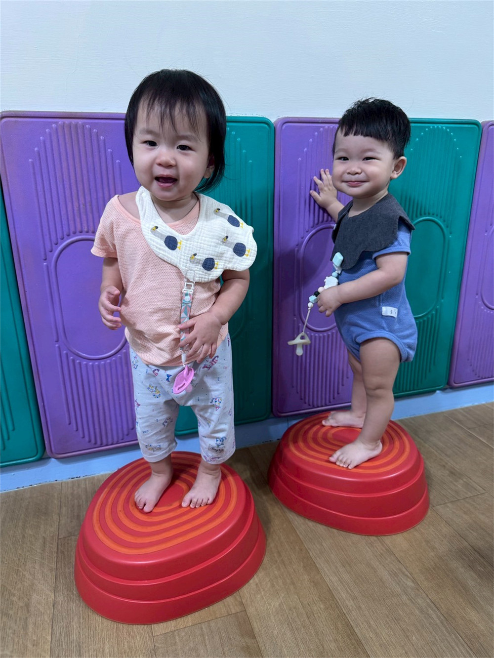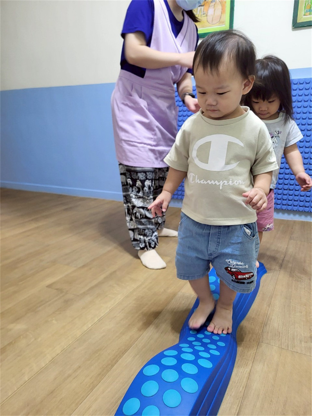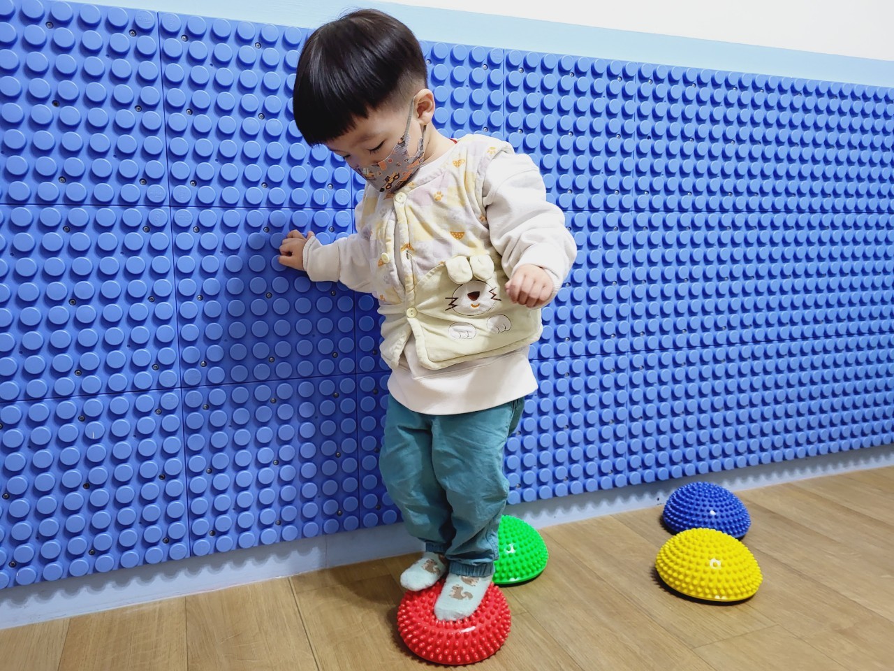 我會扶著牆壁踩在觸覺球上,保持平衡,感受腳底接觸到的感覺~