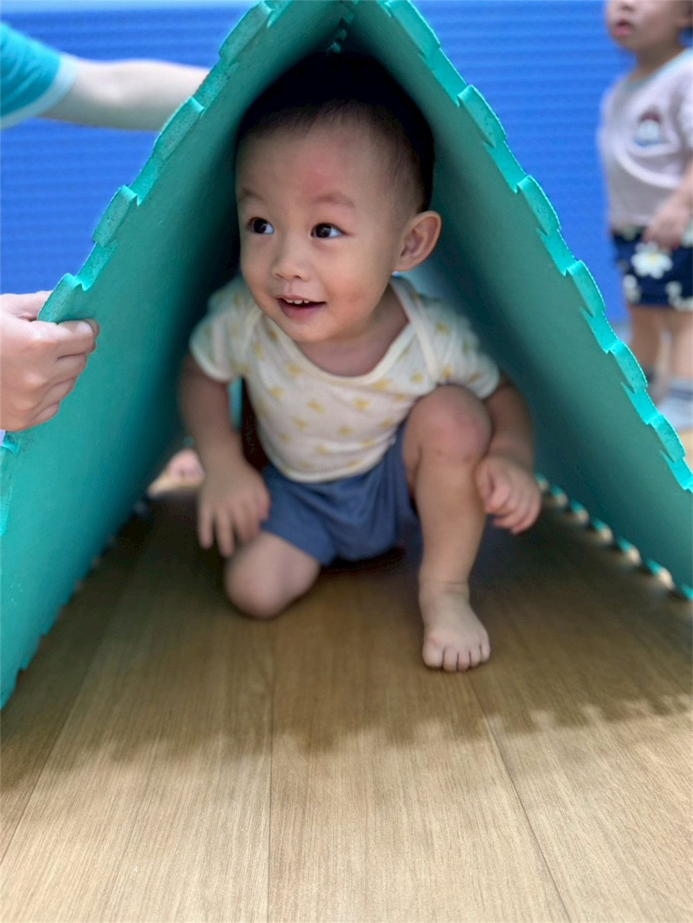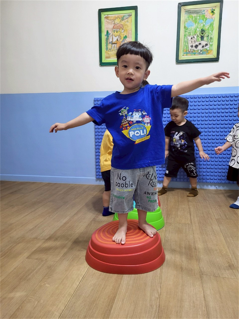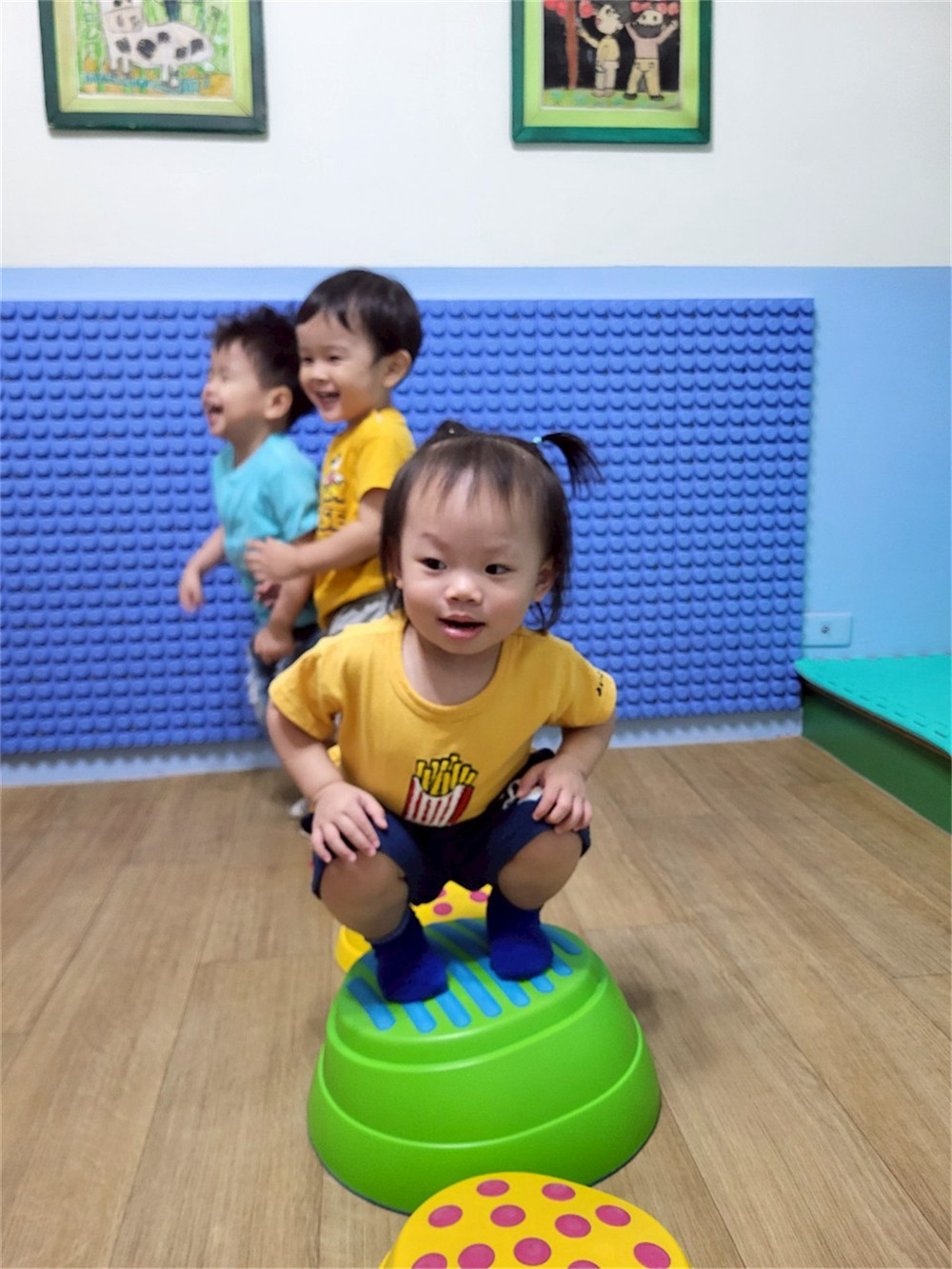 我會扶著牆壁踩在觸覺球上,保持平衡,感受腳底接觸到的感覺~