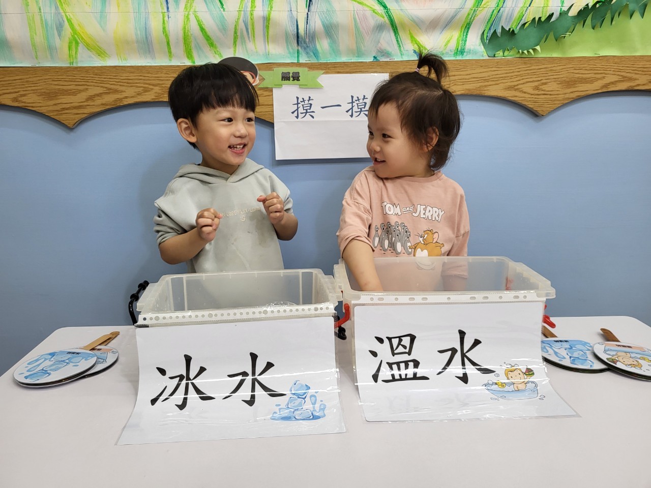 把手放進冰水與溫水裡摸摸看,感受不同的溫度