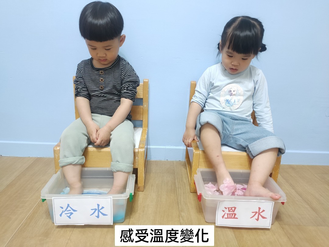 把腳泡在冷水與溫水裡,感受不同的溫度