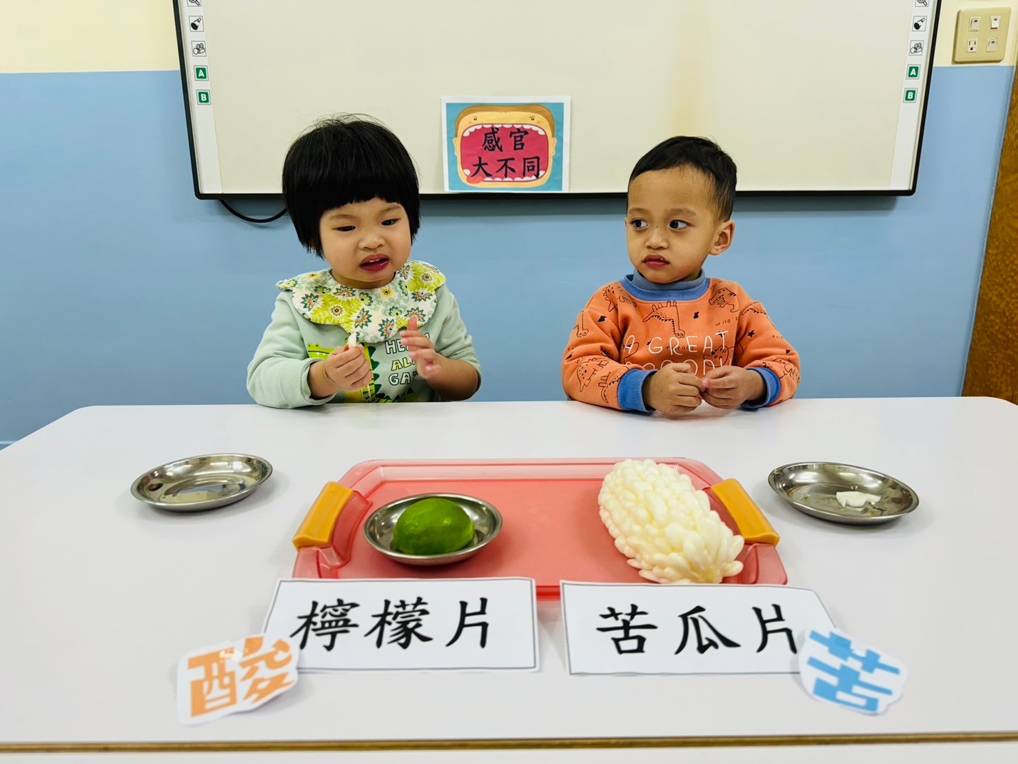 品嚐看看檸檬與苦瓜的味道,咦~好酸喔!